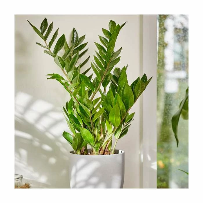 Featuring glossy, oval-shaped leaves that glisten under differing types of light, this charming Zamioculcas Zamiifolia is perfect for accentuating spaces with richly-coloured foliage and its striking silhouette. Perfect for beginners, this plant doesn’t need much more than a monthly feed of liquid fertiliser, and will happily cope in a darker room. Please note, this plant is toxic, so wash your hands after handling, and keep out of reach from children or pets.
