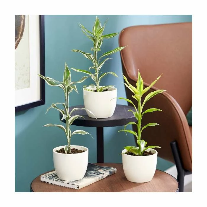 Dracaena plants contain around 200 different varieties with some wild specimens growing to heights of over 50 feet! As houseplants, they are often easy to care for and great for beginners. Fill your home with a variety of these plants with this set of three. Comprising of a tall stalk with an explosion of variegated leaves on top. The long skinny sword-like leaves are a dark shade of green with a slight red hue on the edge. Dracaenas are excellent for adding beautiful foliage to a room with minimal effort. Dracaenas are also excellent plants for purifying the air, named by NASA as one of the best.